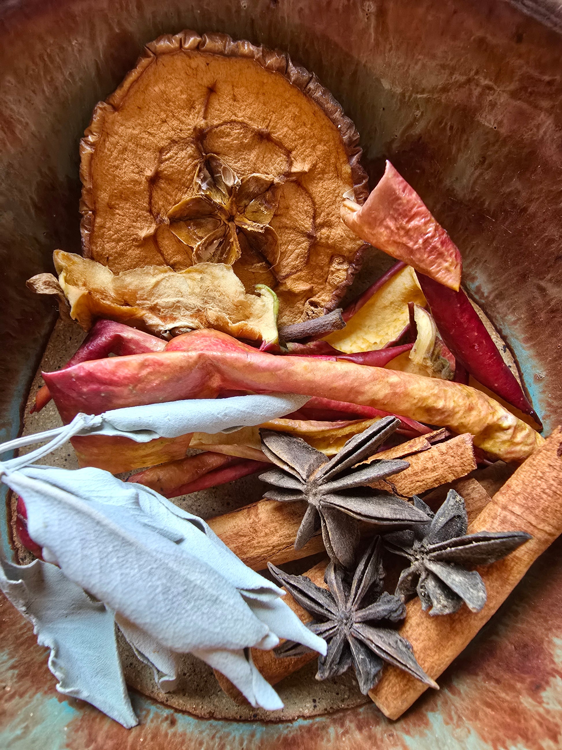 - Fill a pot with water and add your apples, cinnamon sticks, star anise, and a few sprigs of white sage.
