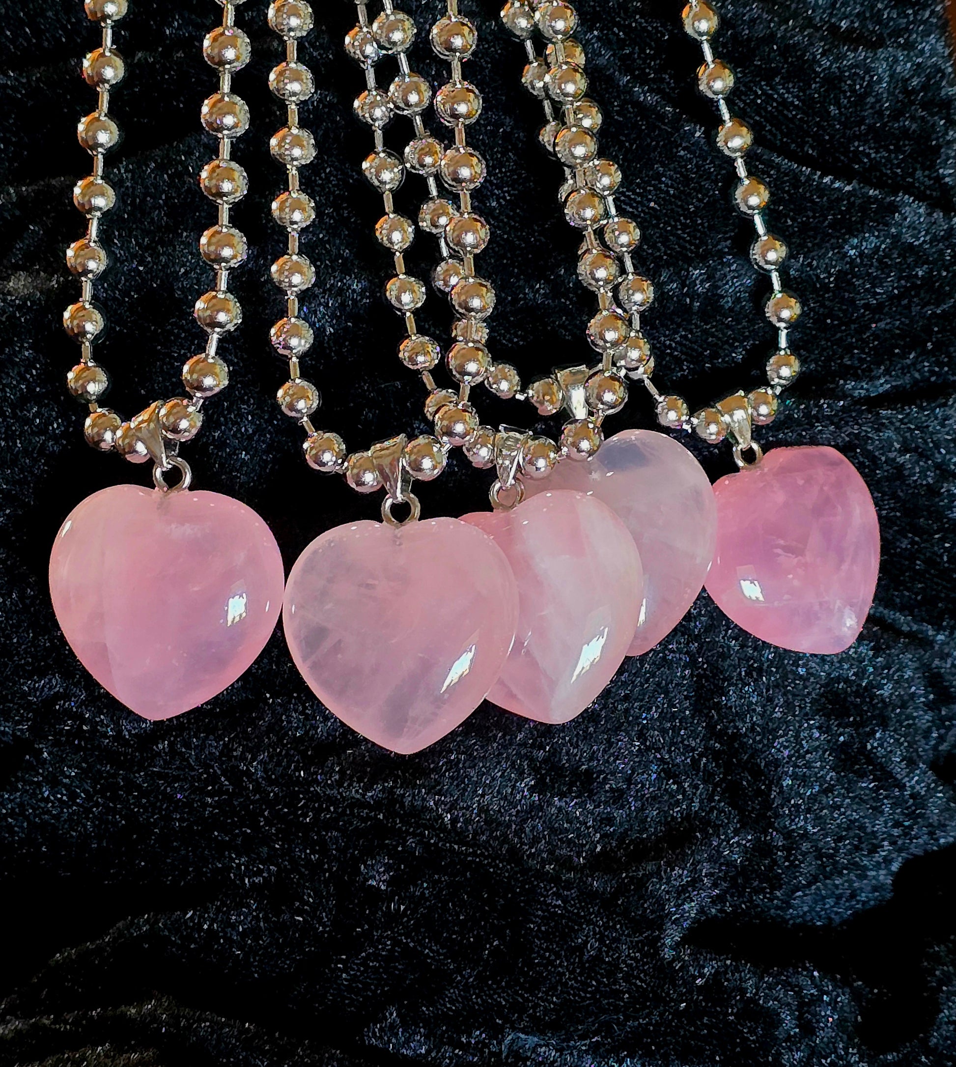 Rose quartz heart pendant on 18" stainless ball chain.